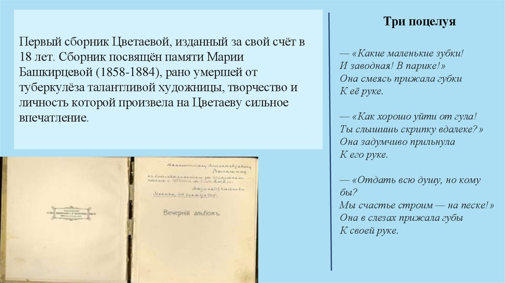 Три поцелуяПервый сборник Цветаевой, изданный за свой счёт в