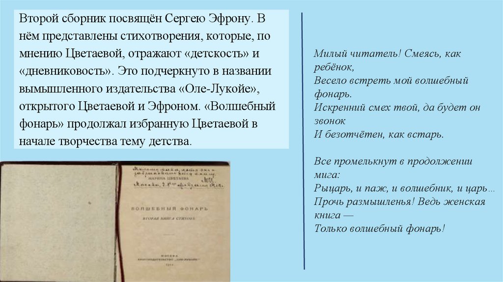Второй сборник посвящён Сергею Эфрону. Внём представлены стихотворения, которые, по