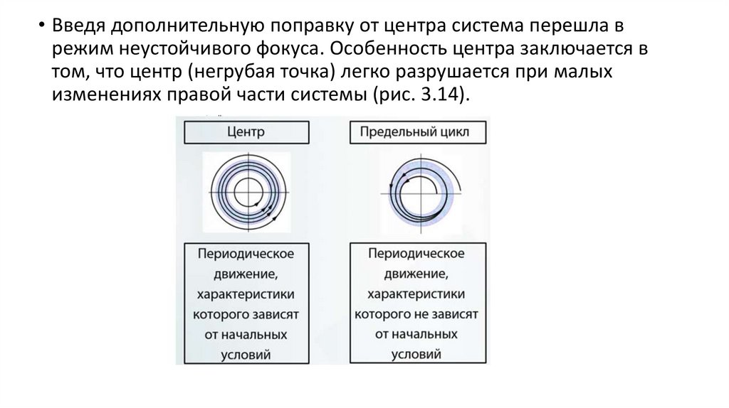 • Введя дополнительную поправку от центра система перешла врежим неустойчивого фокуса. Особенность центра заключается в