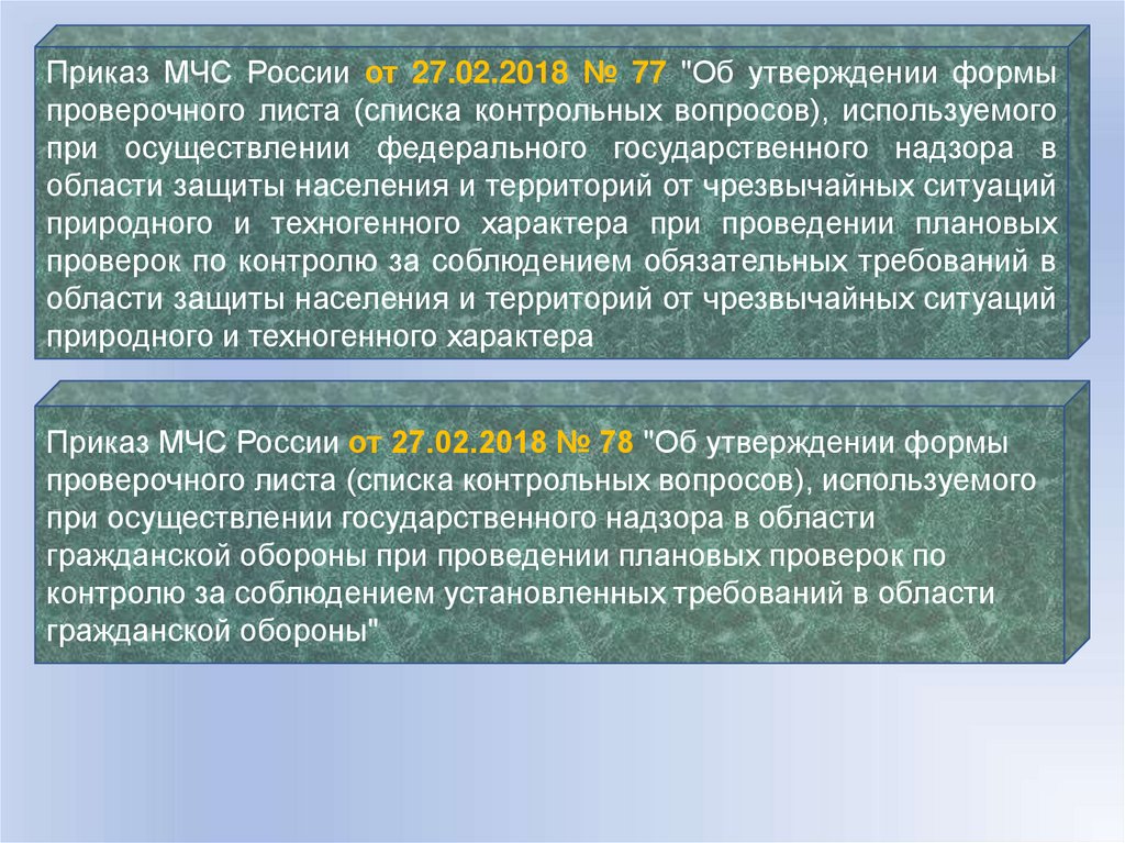 Приказ МЧС России от 27.02.2018 № 77 "Об утверждении формыпроверочного листа (списка контрольных вопросов), используемого