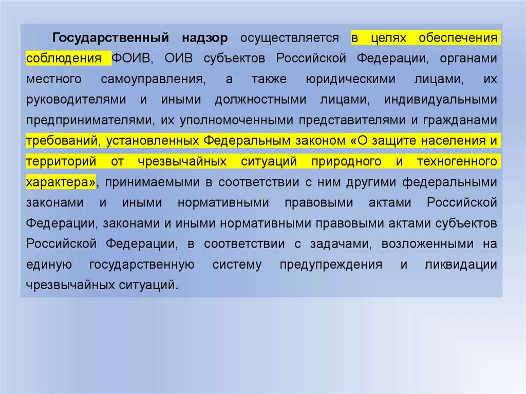 Государственный надзор осуществляется в целях обеспечениясоблюдения ФОИВ, ОИВ субъектов Российской Федерации, органами