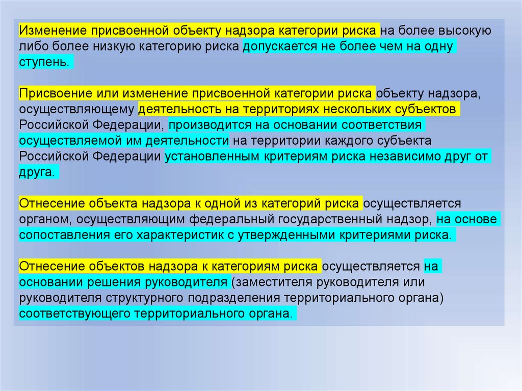 Изменение присвоенной объекту надзора категории риска на более высокуюлибо более низкую категорию риска допускается не более чем на одну