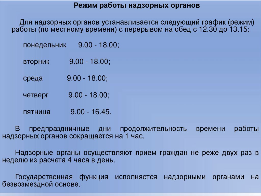 Режим работы надзорных органовДля надзорных органов устанавливается следующий график (режим)