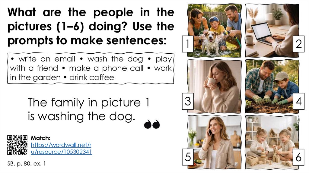 What are the people in thepictures (1–6) doing? Use the