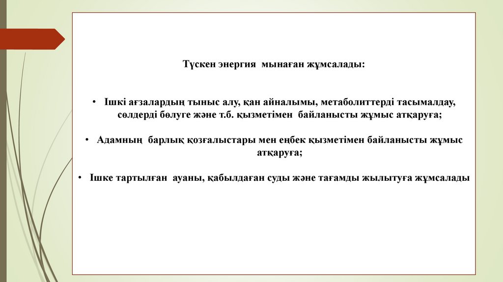 • Ішке тартылған ауаны, қабылдаған суды және тағамды жылытуға жұмсалады