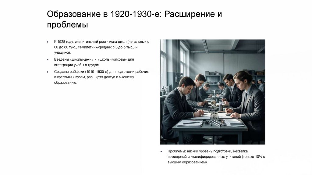 Созданы рабфаки (1919–1930-е) для подготовки рабочих