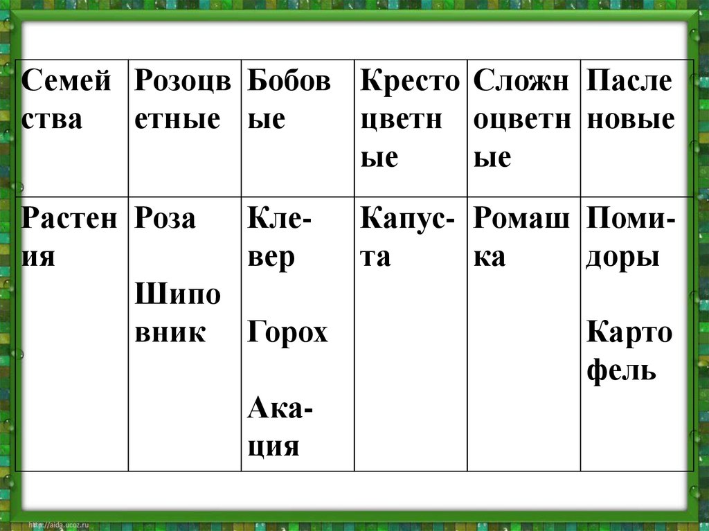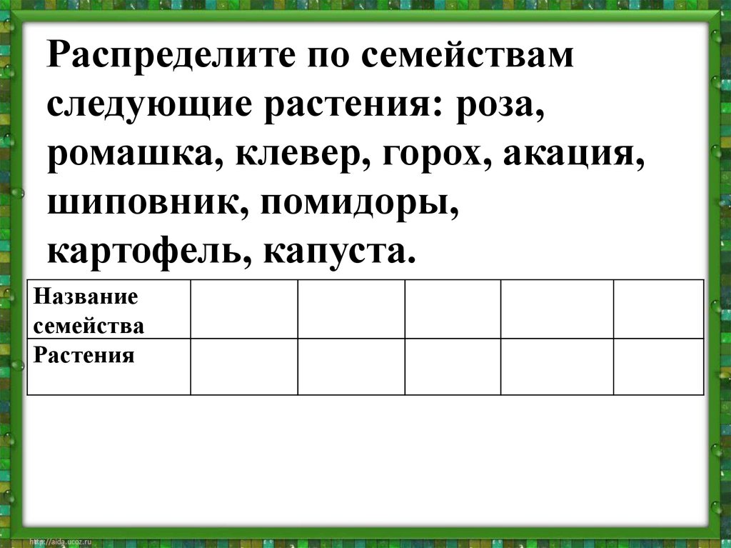 1. Распределите по семействам следующие растения: роза, ромашка, клевер, горох, акация, шиповник, помидоры, картофель, капуста.