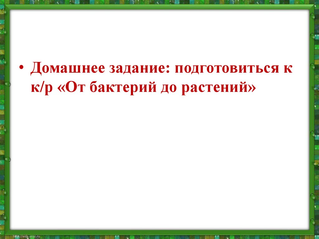 • Домашнее задание: подготовиться кк/р «От бактерий до растений»