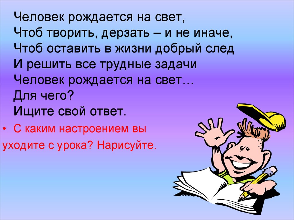 Человек рождается на свет,Чтоб творить, дерзать – и не иначе,