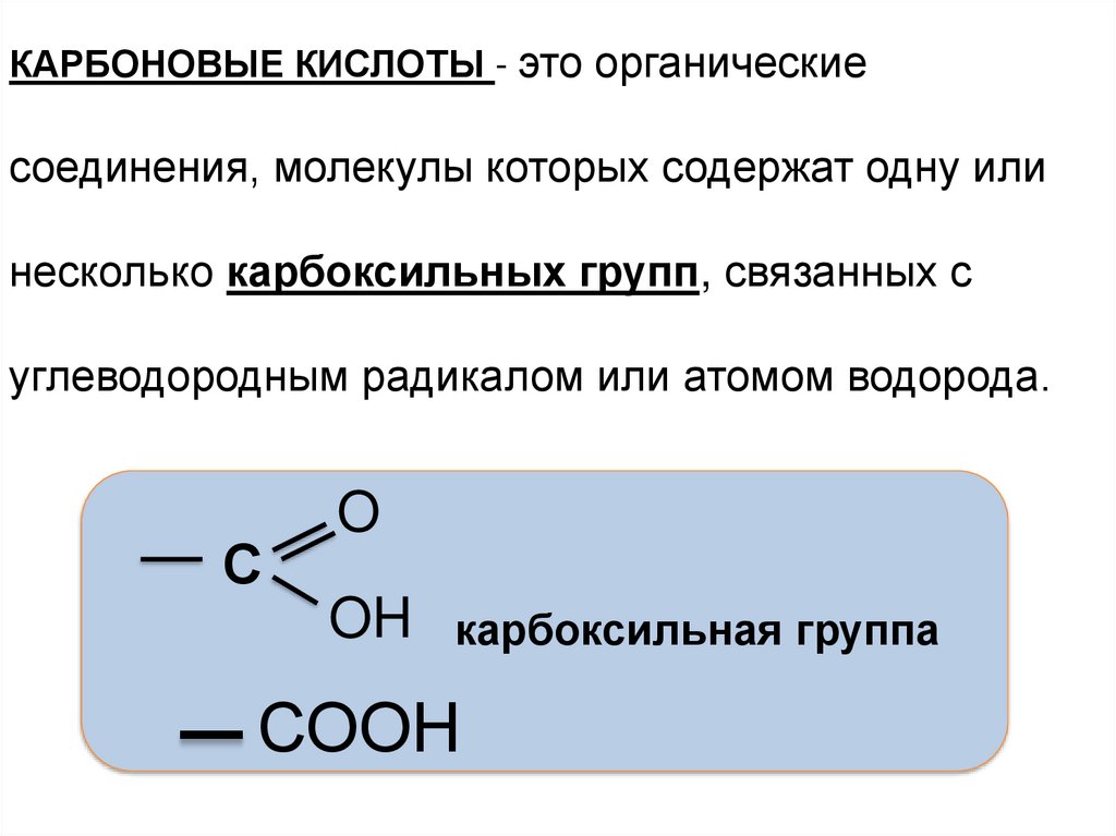 КАРБОНОВЫЕ КИСЛОТЫ - это органическиесоединения, молекулы которых содержат одну или