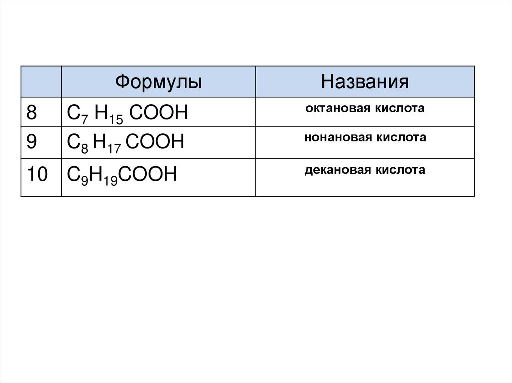 • Высшие кислоты (начиная с пеларгоновой (нонановой) CH3 – (CH2)7 – COOH )