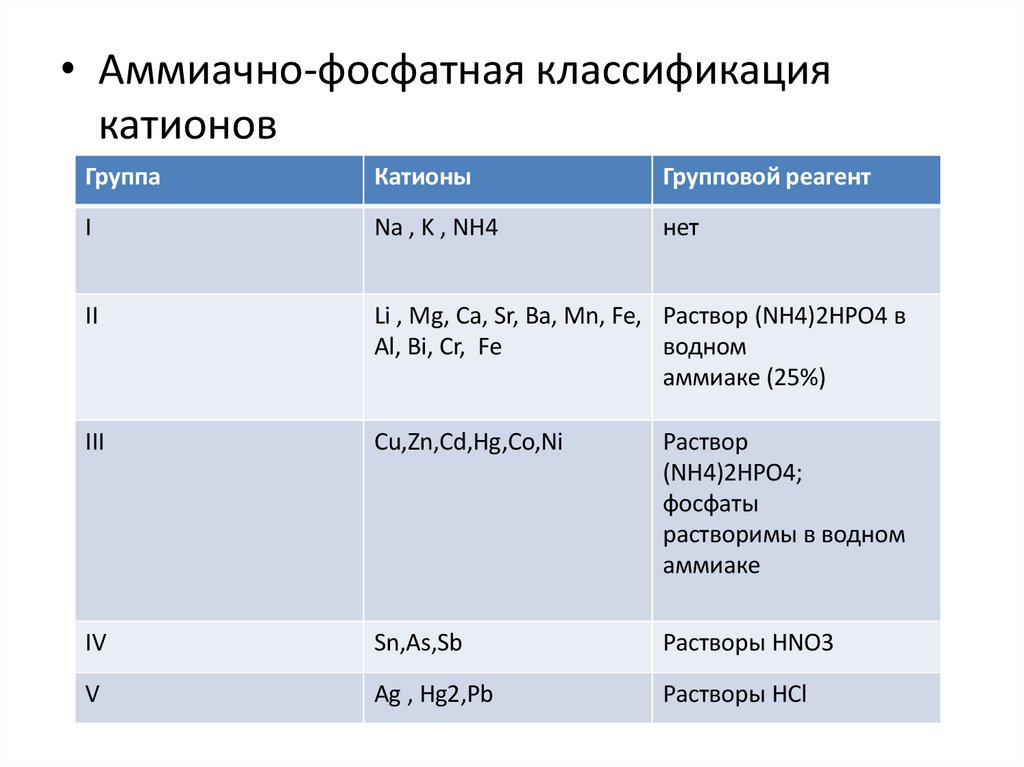 • Аммиачно-фосфатная классификациякатионов