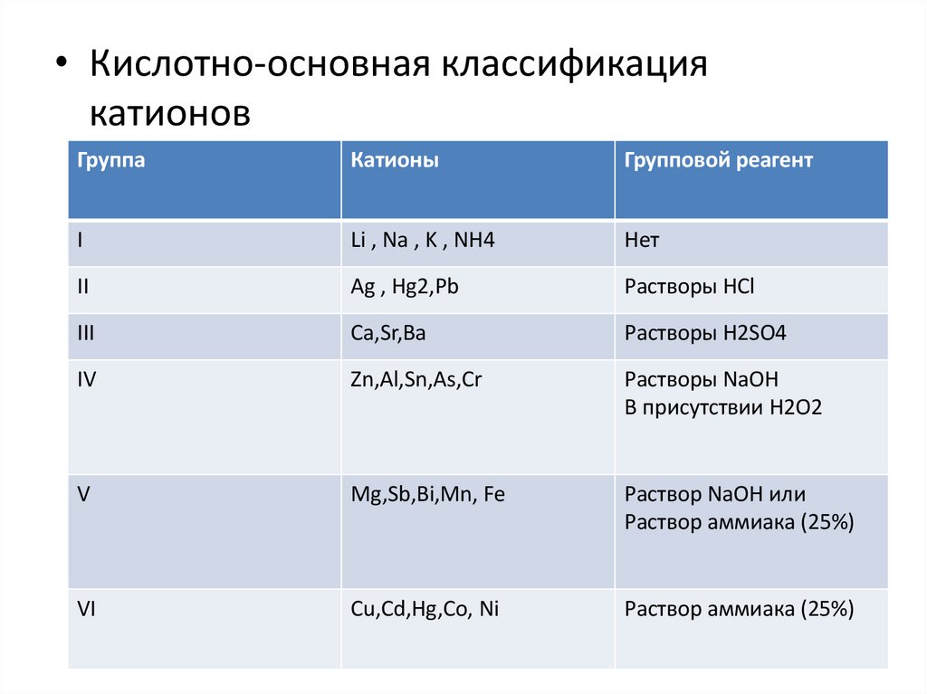• Кислотно-основная классификациякатионов