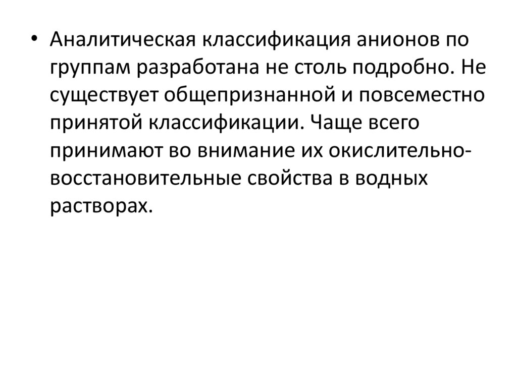 • Аналитическая классификация анионов погруппам разработана не столь подробно. Не