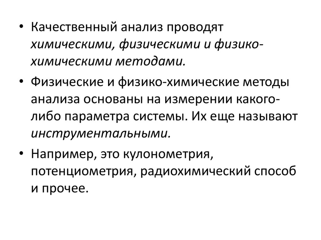 • Качественный анализ проводятхимическими, физическими и физикохимическими методами.