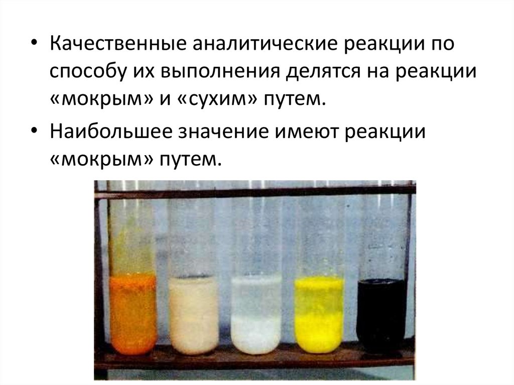 • Качественные аналитические реакции поспособу их выполнения делятся на реакции