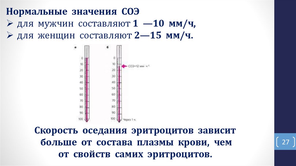 Нормальные значения СОЭдля мужчин составляют 1 —10 мм/ч,
