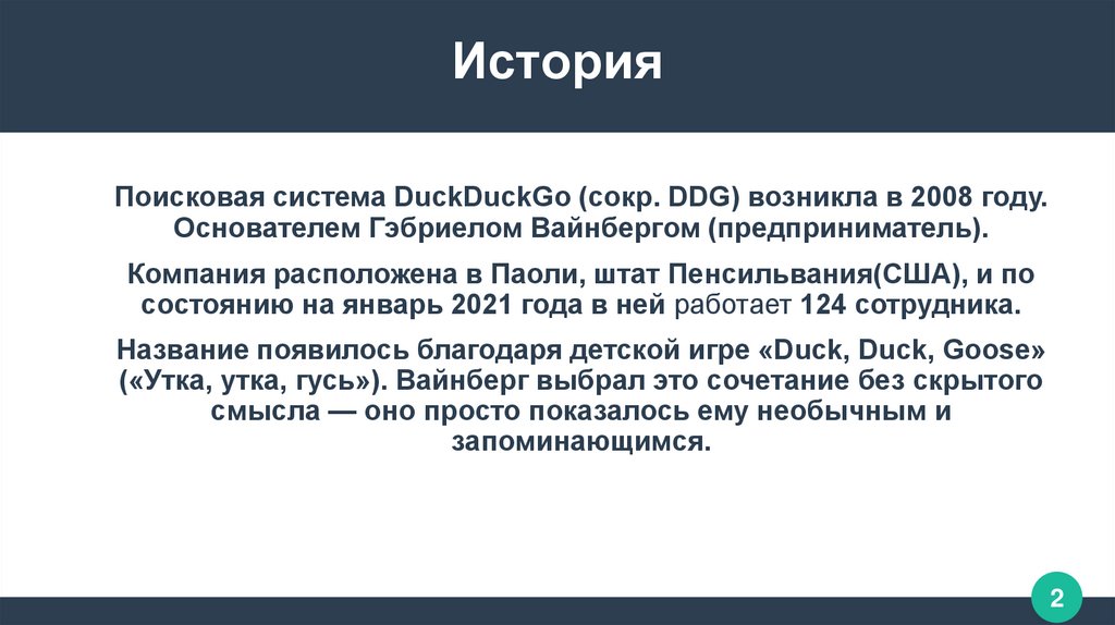 ИсторияПоисковая система DuckDuckGo (сокр. DDG) возникла в 2008 году.