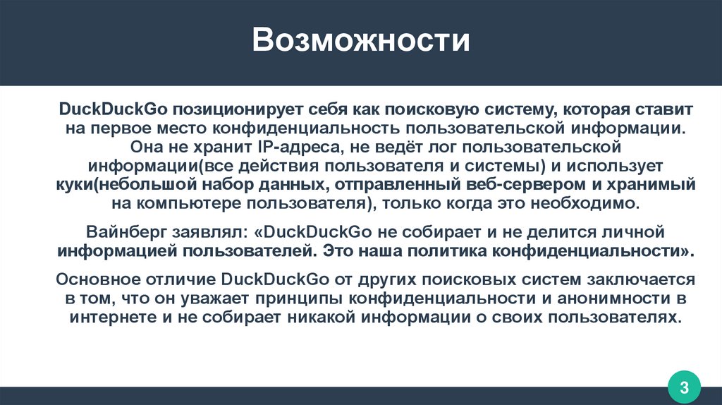 ВозможностиDuckDuckGo позиционирует себя как поисковую систему, которая ставит
