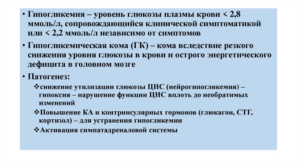 • Гипогликемия – уровень глюкозы плазмы крови < 2,8ммоль/л, сопровождающийся клинической симптоматикой
