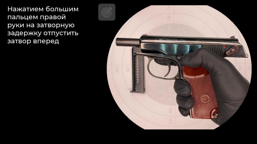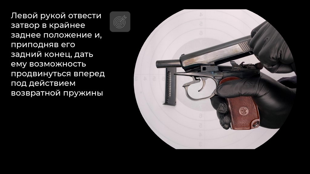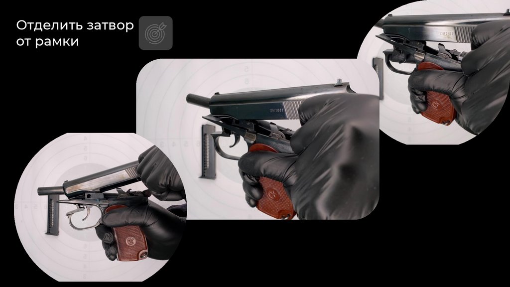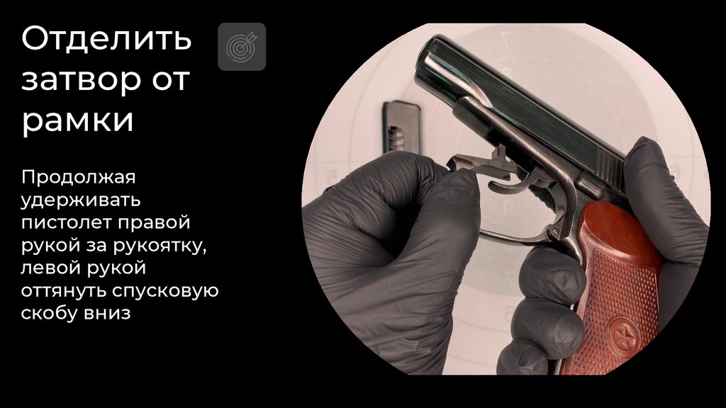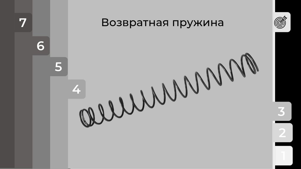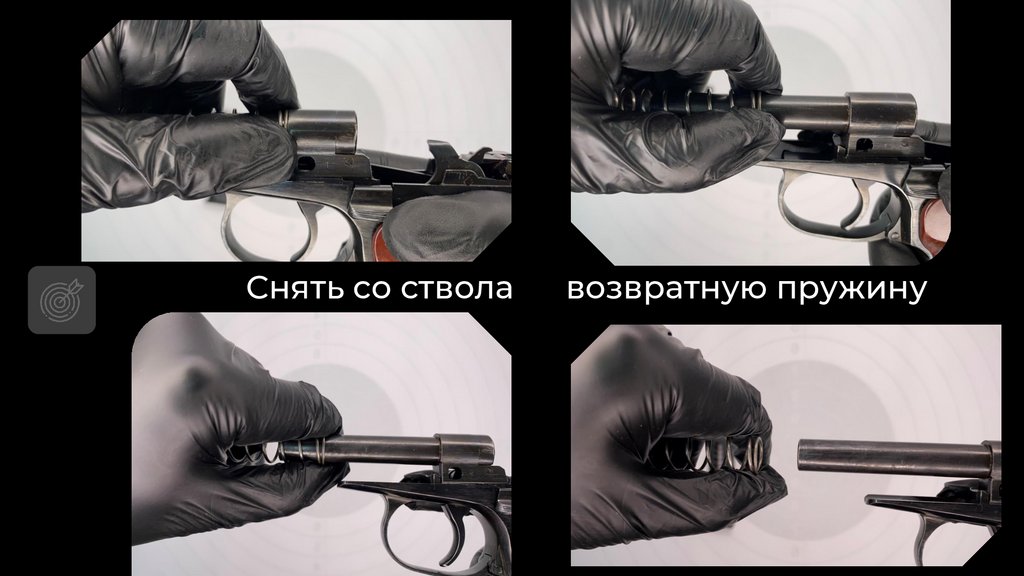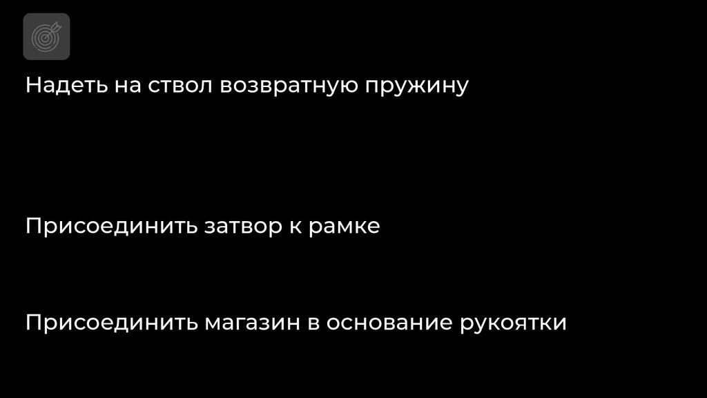 Надеть на ствол возвратную пружинуПрисоединить затвор к рамке