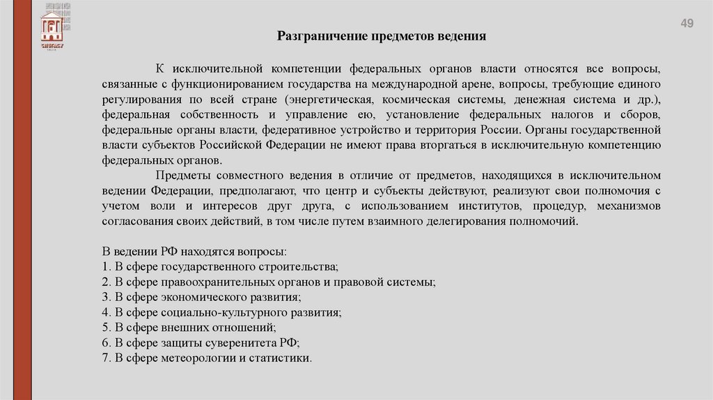 Разграничение предметов веденияК исключительной компетенции федеральных органов власти относятся все вопросы,