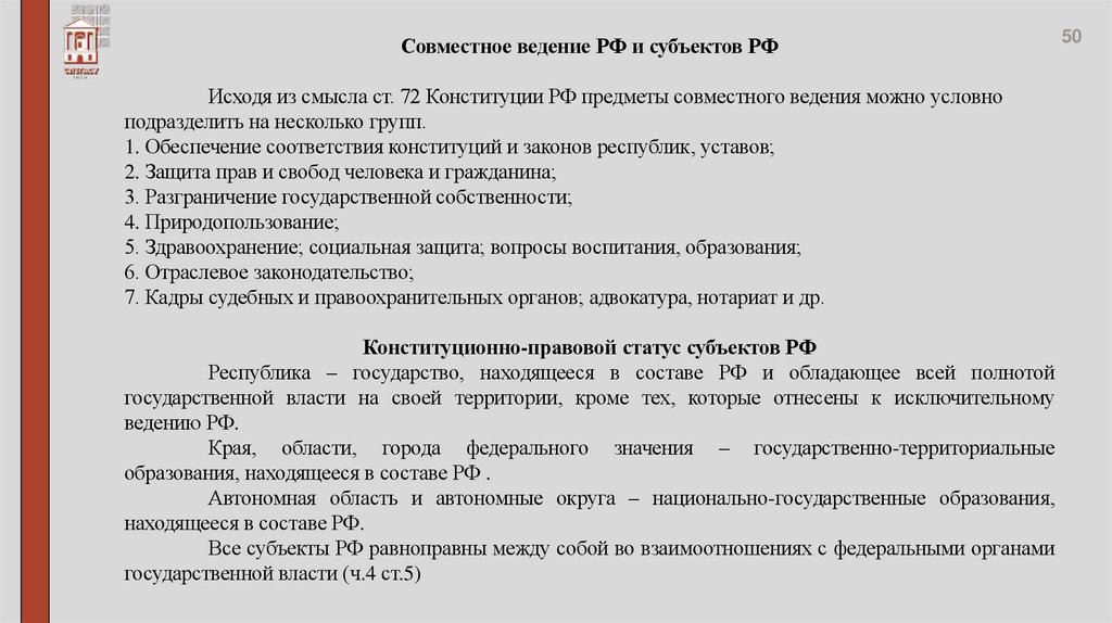 Совместное ведение РФ и субъектов РФИсходя из смысла ст. 72 Конституции РФ предметы совместного ведения можно условно