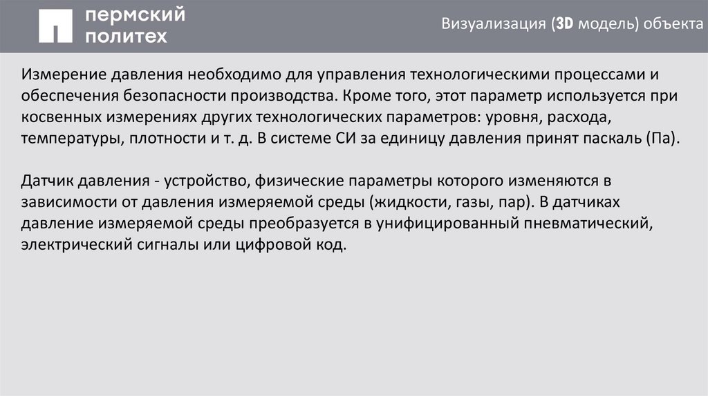 Визуализация (3D модель) объектаИзмерение давления необходимо для управления технологическими процессами и