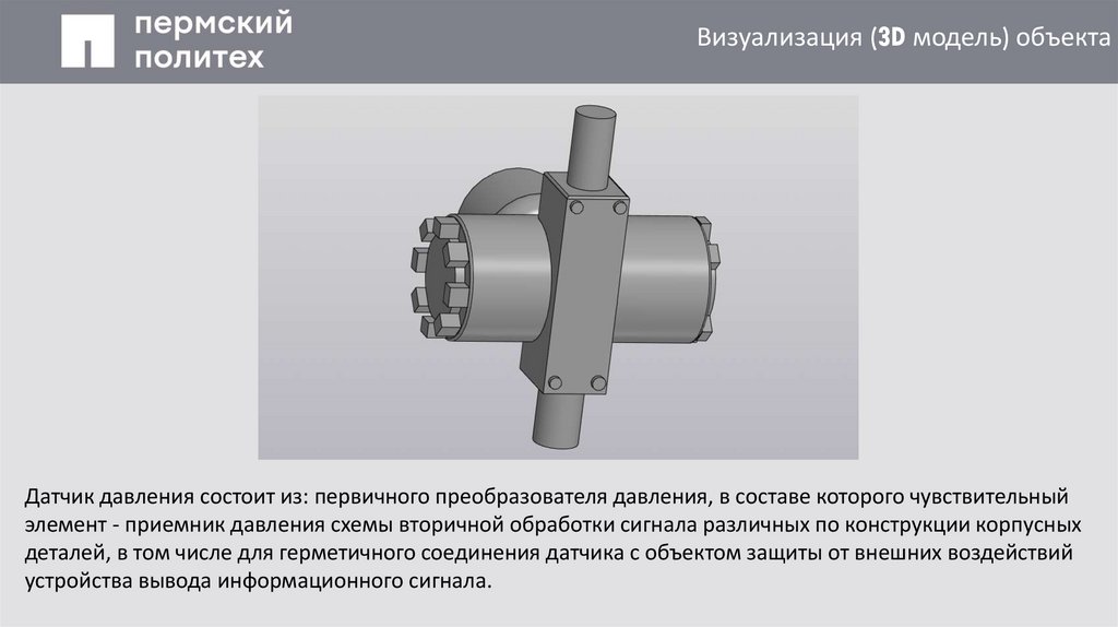 Визуализация (3D модель) объектаДатчик давления состоит из: первичного преобразователя давления, в составе которого чувствительный