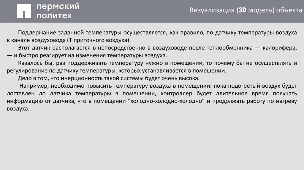 Визуализация (3D модель) объектаПоддержание заданной температуры осуществляется, как правило, по датчику температуры воздуха