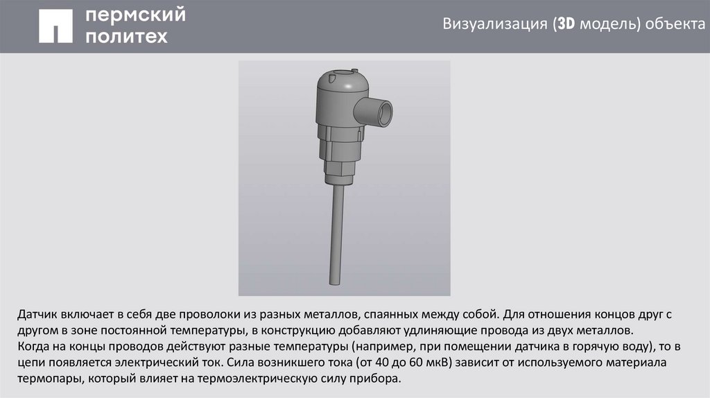 Визуализация (3D модель) объектаДатчик включает в себя две проволоки из разных металлов, спаянных между собой. Для отношения концов друг с