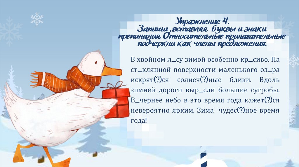 Упражнение 4.Запиши , вставляя буквы и знаки