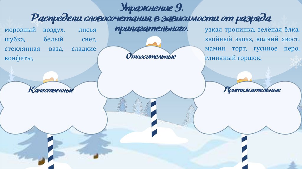Упражнение 9.Распредели словосочетания в зависимости от разряда
