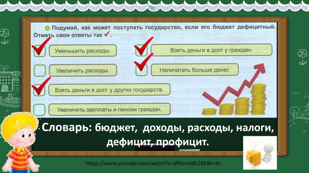 Словарь: бюджет, доходы, расходы, налоги,дефицит, профицит.