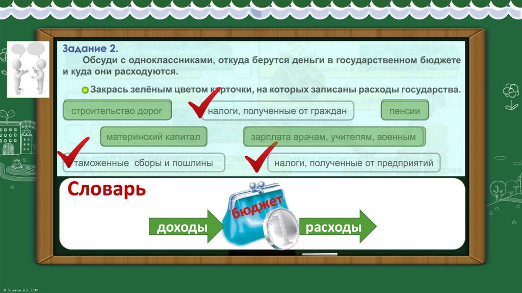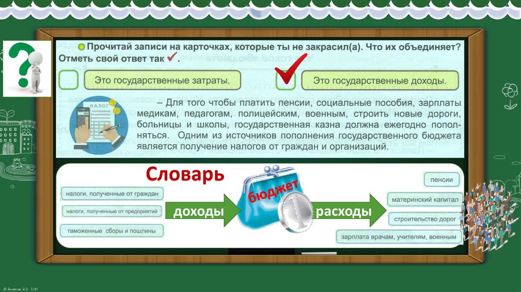 Словарь: бюджет, доходы, расходы, налоги.