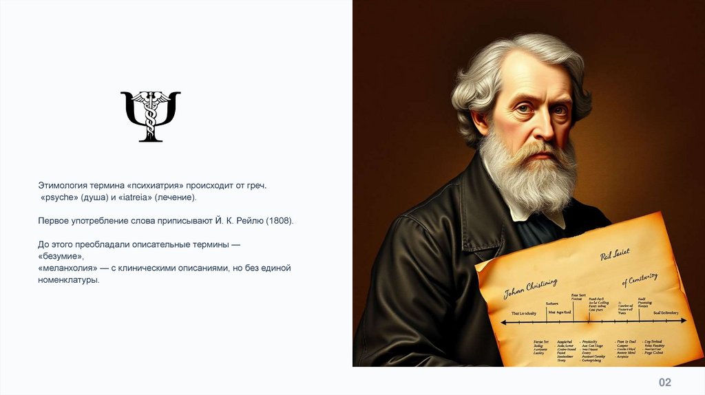 Этимология термина «психиатрия» происходит от греч.«psyche» (душа) и «iatreia» (лечение).