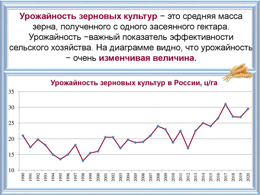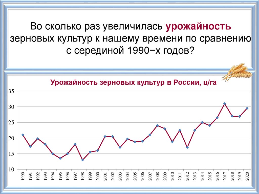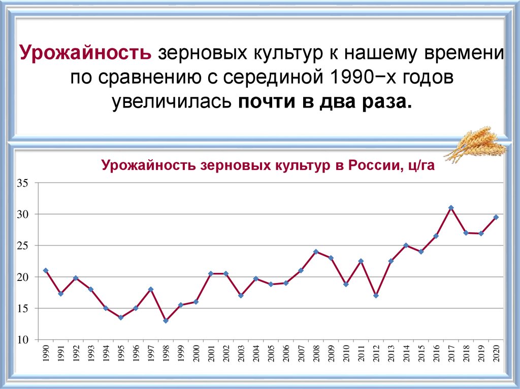 Урожайность зерновых культур к нашему временипо сравнению с серединой 1990−х годов