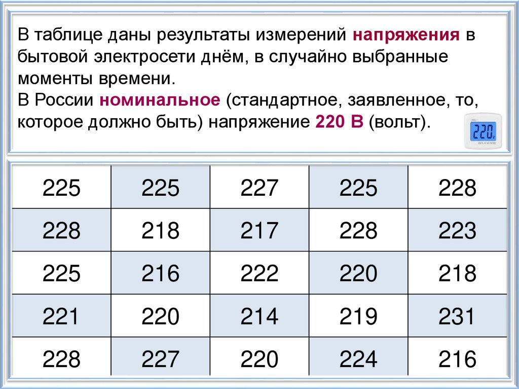 В таблице даны результаты измерений напряжения вбытовой электросети днём, в случайно выбранные