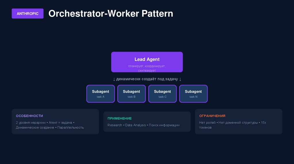 Бизнес-аналитик, Системный аналитик, Архитектор, QA-инженер. Декомпозирует на Worker Agents.