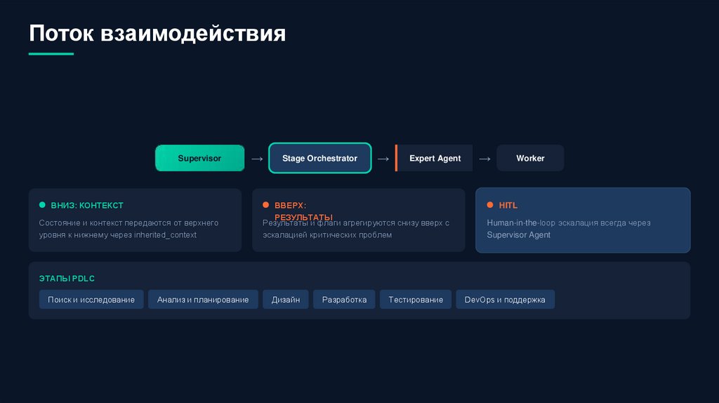 Координатор всего жизненного цикла. Управляет переходами между этапами. HITL эскалация.