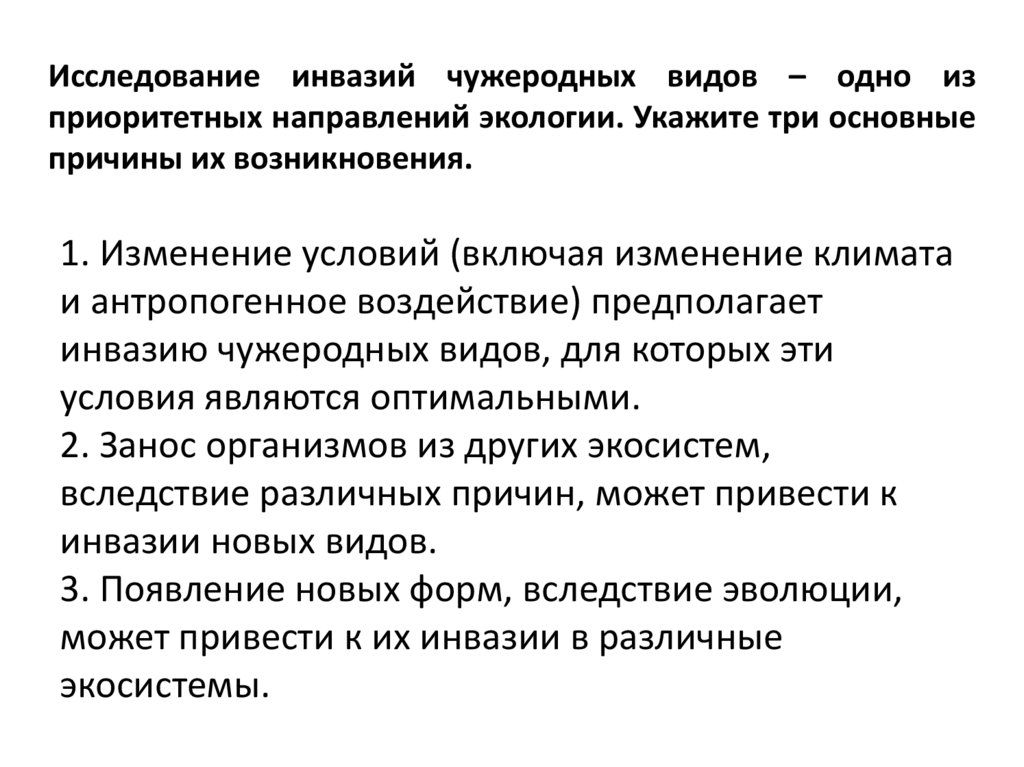 Исследование инвазий чужеродных видов – одно изприоритетных направлений экологии. Укажите три основные
