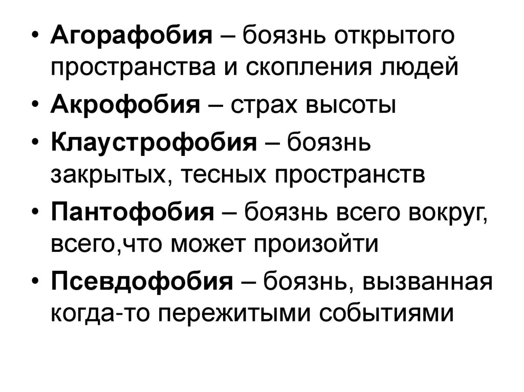 • Агорафобия – боязнь открытогопространства и скопления людей