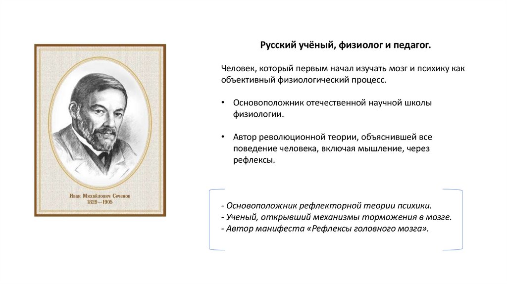 Русский учёный, физиолог и педагог.Человек, который первым начал изучать мозг и психику как