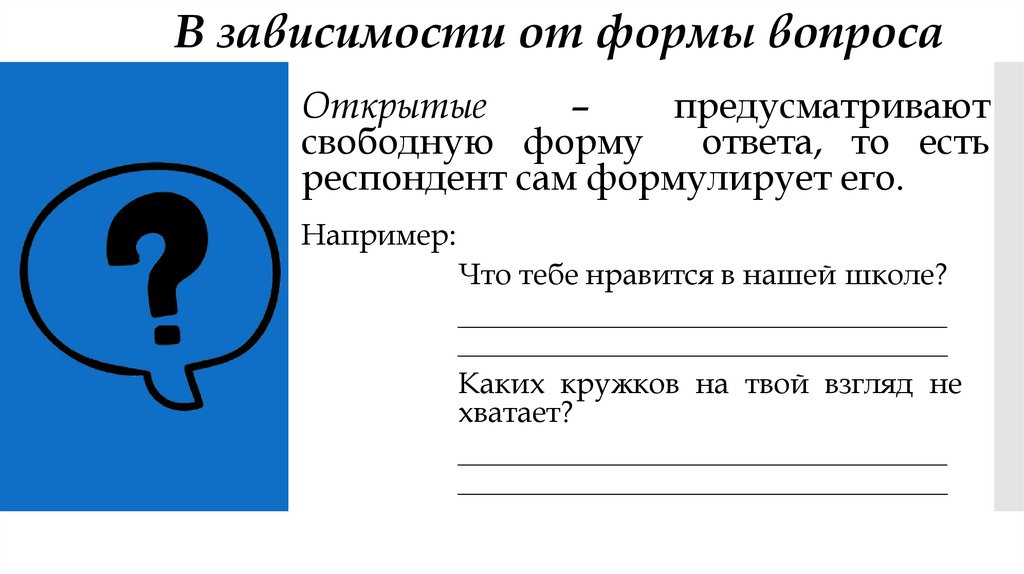По форме вопросы разделяются на открытые (свободный ответ, например: «Что вы думаете