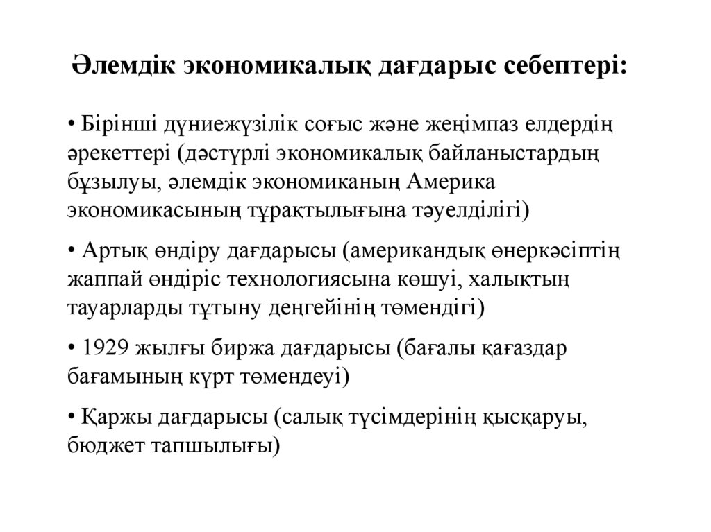 Әлемдік экономикалық дағдарыс себептері:• Бірінші дүниежүзілік соғыс және жеңімпаз елдердің