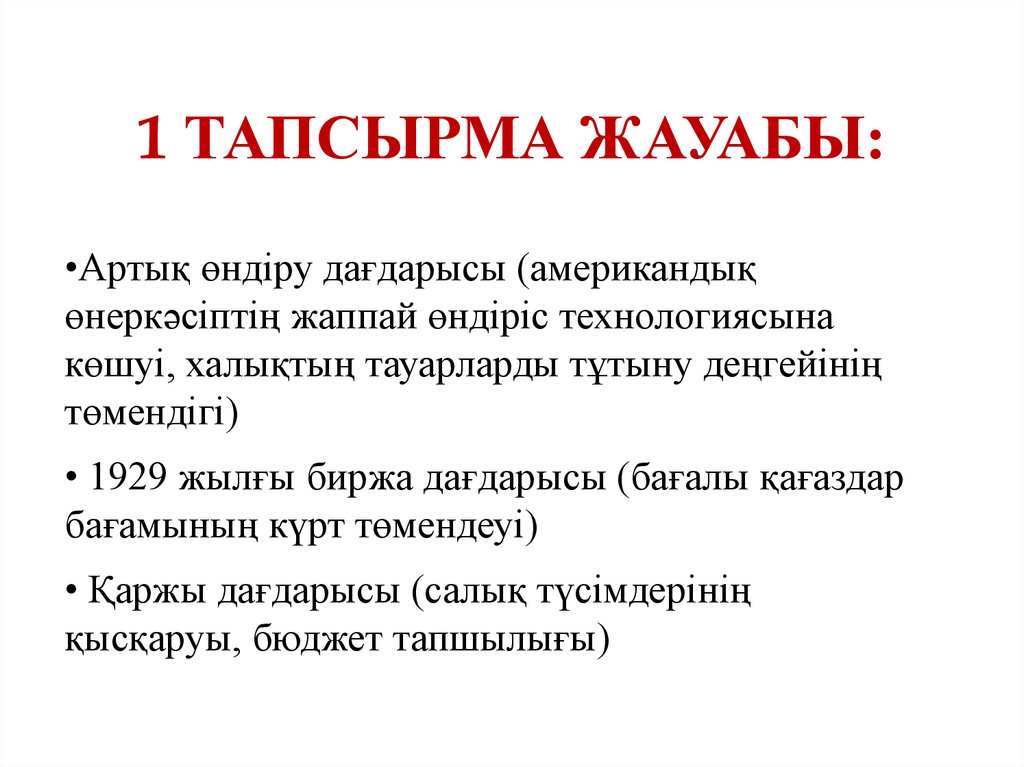 1 ТАПСЫРМА ЖАУАБЫ:•Артық өндіру дағдарысы (американдық