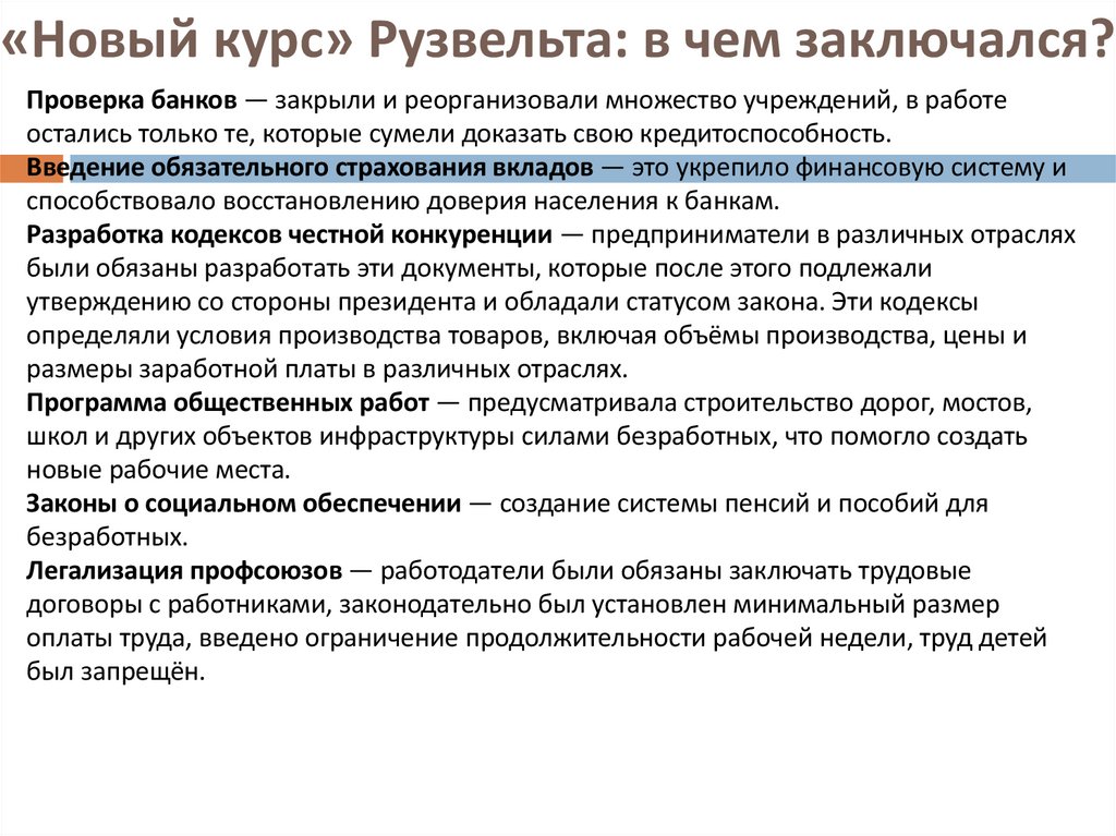 «Новый курс» Рузвельта: в чем заключался?Проверка банков — закрыли и реорганизовали множество учреждений, в работе