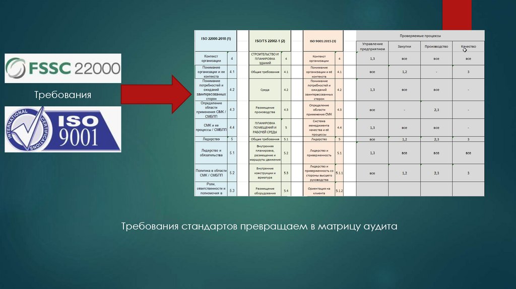 ТребованияТребования стандартов превращаем в матрицу аудита
