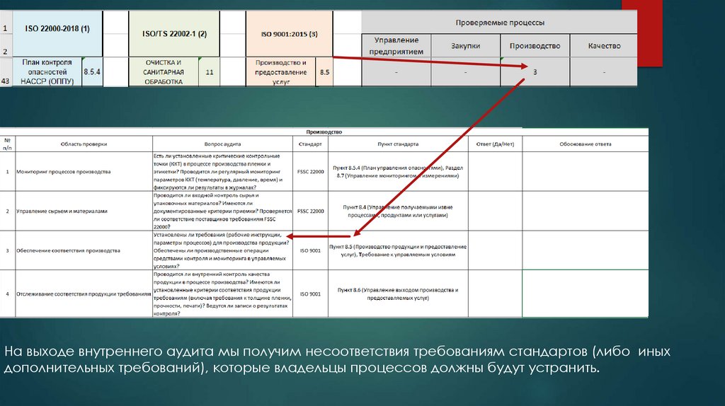 На выходе внутреннего аудита мы получим несоответствия требованиям стандартов (либо иныхдополнительных требований), которые владельцы процессов должны будут устранить.
