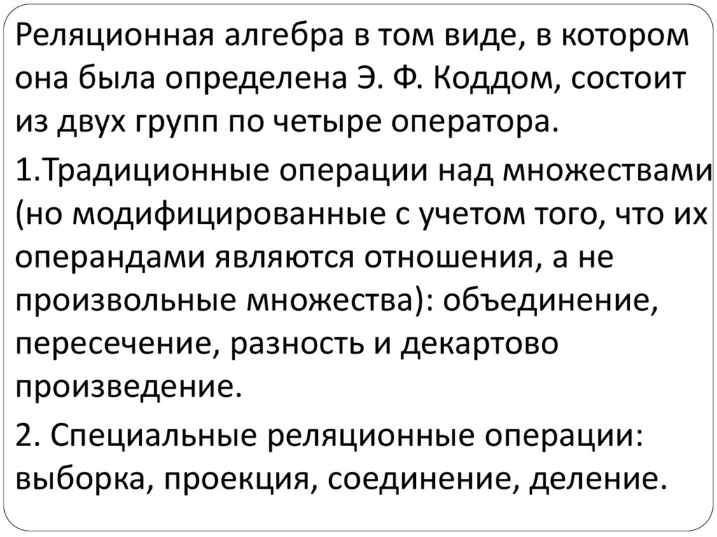 Реляционная алгебра в том виде, в которомона была определена Э. Ф. Коддом, состоит